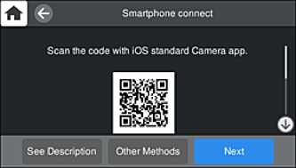 ใช้แอปกล้องสำหรับเวอร์ชัน iOS 11 หรือใหม่กว่า คุณไม่สามารถเชื่อมต่อกับเครื่องพิมพ์โดยใช้แอปกล้องสำหรับเวอร์ชัน iOS 10 หรือเก่ากว่า นอกจากนี้คุณยังไม่สามารถใช้แอปสำหรับสแกนรหัส QR ด้วย หากคุณไม่สามารถเชื่อมต่อ ให้เลือก วิธีอื่น ๆ บนแผงควบคุมของเครื่องพิมพ์ ดูลิงก์ข้อมูลที่เกี่ยวข้องด้านล่างสำหรับรายละเอียดของการเชื่อมต่อ