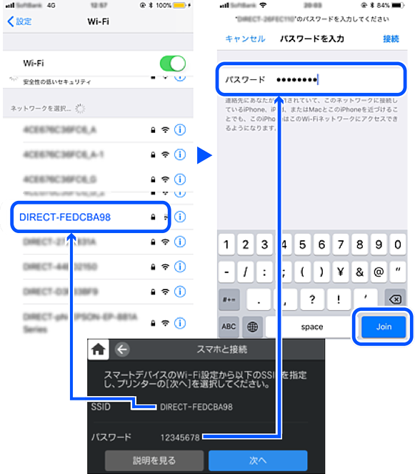 スマートデバイスのWi-Fi接続画面を表示し、プリンターの操作パネルに表示されたSSIDを選択して、パスワードを入力します。