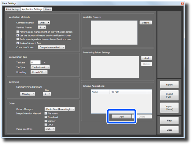 Enter a name in Name and select %ProgramFiles%\EPSON\EPSON SureLab OrderController v3 > DFEWatcher.exe in File Path.