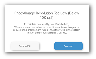 *3: When you tap the button, a warning is displayed if the resolution of the image being edited falls below the Recommended photo resolution for optimal print quality set in Craft Admin. To maintain print quality, close the warning and replace the image with a higher resolution one using Back to Edit, or reduce the enlarge/reduce ratio.