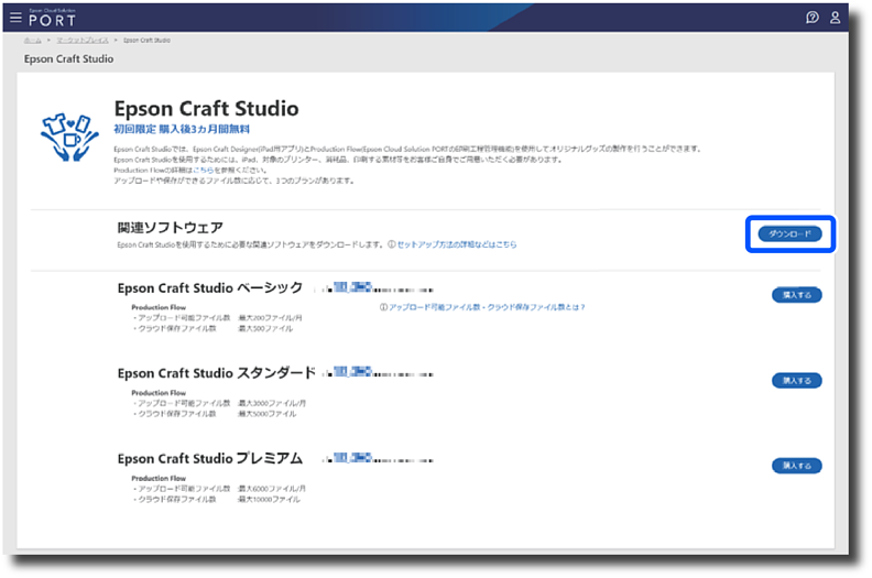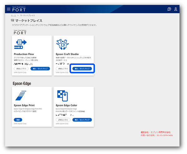の[Epson Craft Studio]のアイコン(タイル)にある[購入・セットアップ]をクリックします。