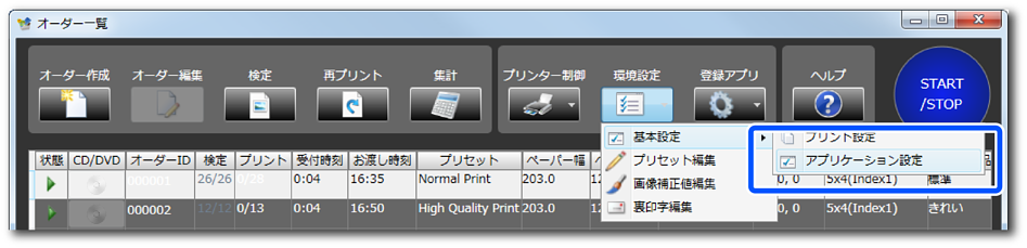 SureLab OrderControllerで[オーダー一覧]画面の[環境設定]をクリックし、[基本設定]-[アプリケーション設定]をクリックします。