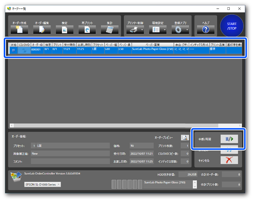 [オーダー受付時の状態(監視フォルダ)]で[保留]を選択すると、オーダーはSureLab OrderControllerの[オーダー一覧]画面に保留されます。