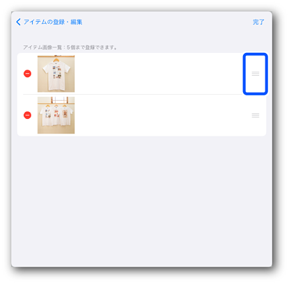 注文画面に表示するアイテムのイメージ画像を設定します。アイテム画像は5枚まで設定できます。