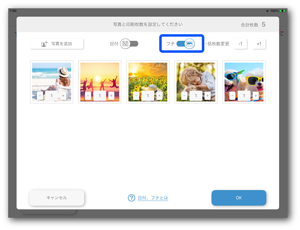 [フチ]をタップして、フチの印刷を有効にします。