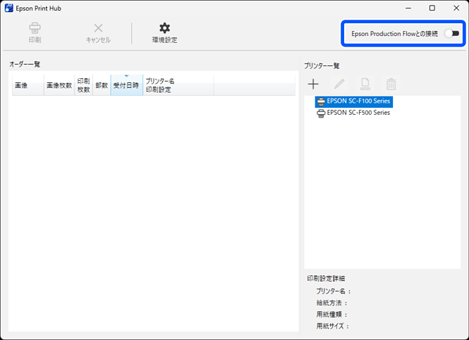 Production Flowに接続している場合、印刷設定の操作はできません。