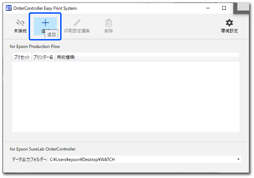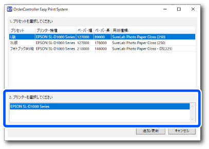 [追加/更新]ボタンは、プリセットとプリンタ―のどちらも選択された場合に有効になります。