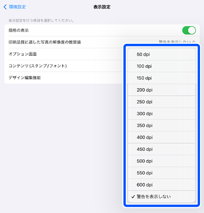お客様の取り込んだ写真の解像度が低い、またはデザインを編集したことで解像度が下がった場合、印刷品質が低下する可能性があります。印刷品質を確保できる推奨値を設定することで、設定を下回ったときにお客様へ印刷品質が低下することを伝えるメッセージが表示されます。 初期値は[警告を表示しない]が設定されています。 ![]() |