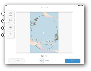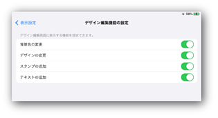 アイテムの編集画面で使用できる機能を設定できます。 初期設定ではすべての機能が表示されます。 ![]() ①背景色の変更 ②デザインの変更 ③スタンプの追加 ④テキストの追加 ![]() |
