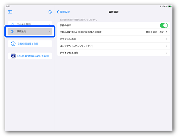 [環境設定]をタップして、環境設定画面に戻ります。