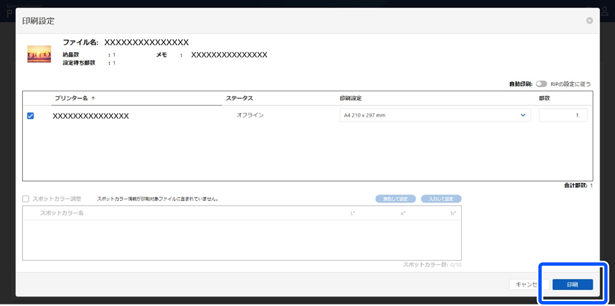 各プリンターの印刷アプリケーションでオーダーを保留する設定の場合、Production Flowから送信したオーダーは自動で印刷されません。