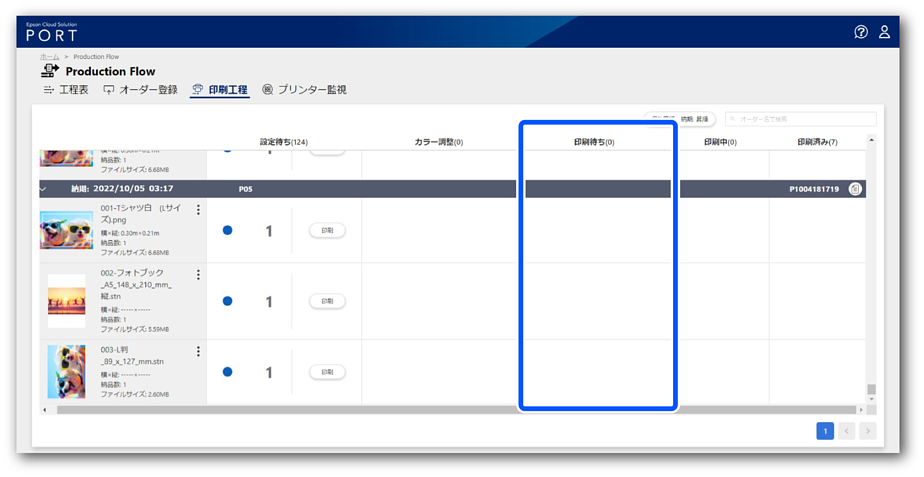 印刷指示をした部数と作業のステータスが[印刷待ち]に表示されていることを確認します。