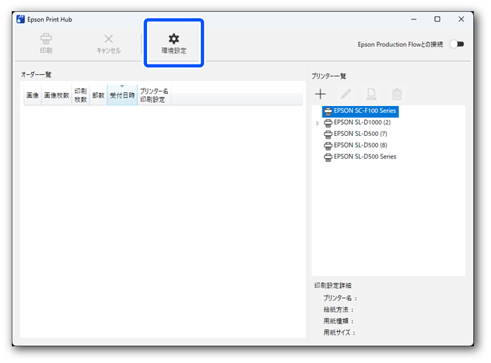 Print HubがProduction Flowからオーダーを受け付けたときの処理を設定できます。