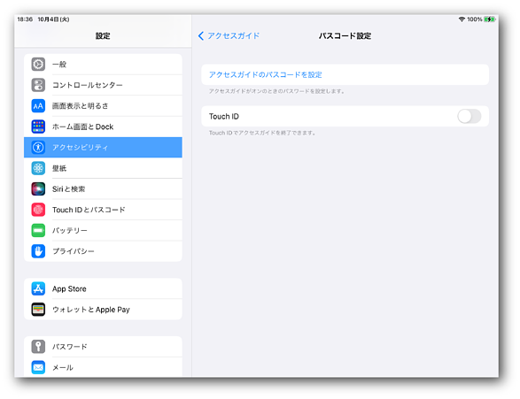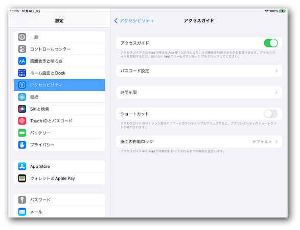 フルスクリーンアプリとアクセスガイドの設定をしたい