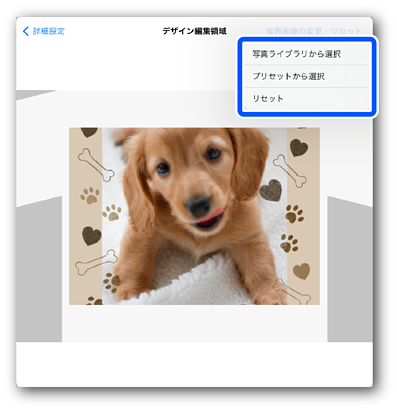 [写真ライブラリから選択]、[プリセットから選択]または[リセット]から操作を選択します。