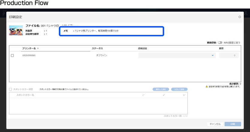 作業メモはProduction Flowの[印刷工程]画面や注文票で確認できます。