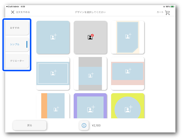 [おすすめ]、[シンプル]、[クリエーター]の3つのタブからテンプレートを選択します。