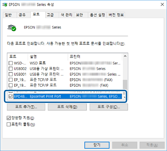 포트 열에 체크되어 있는 인쇄 포트가 사용 가능한 포트입니다. 설명에서 포트 종류를 확인할 수 있습니다.