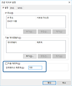 자동 메트릭 확인란을 지우고 인터페이스 메트릭에 "100"을 입력합니다.