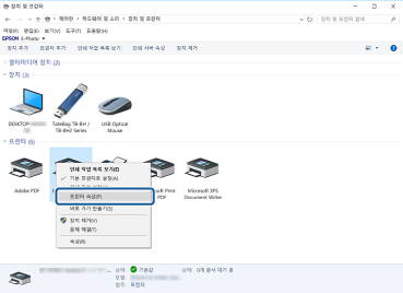 프린터 아이콘을 마우스 오른쪽 버튼으로 클릭한 후 프린터 속성을 클릭합니다.