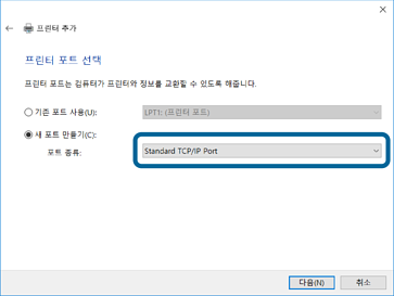 새 포트 만들기를 선택하고, 포트 종류에서 표준 TCP/IP 포트를 선택한 후 다음을 클릭합니다.