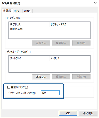 [自動メトリック]のチェックを外して、[インターフェイスメトリック]に「100」を入力します。