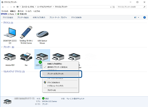 対象プリンターのアイコンを右クリックして、[プリンターのプロパティ]をクリックします。