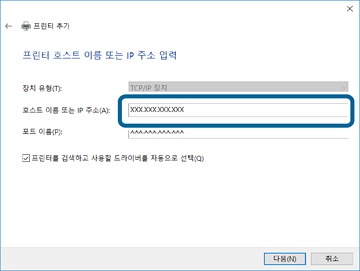호스트 이름 또는 IP 주소 또는 프린터 이름 또는 IP 주소에 프린터의 IP 주소 또는 프린터 이름을 입력한 후 다음을 클릭합니다.