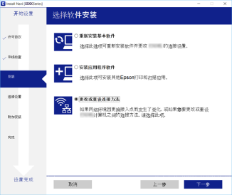 如果显示选择软件安装屏幕,请选择更改或重设连接方法,然后单击下一步。