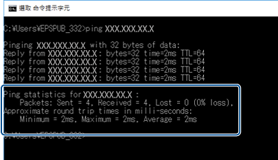輸入「ping xxx.xxx.xxx.xxx」,然後按下確認 (Enter) 鍵。