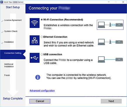 Калі з'яўляецца экран Выбар усталявання ПЗ, выберыце Змяніце або перанастройце метад падлучэння і націсніце Далей.
