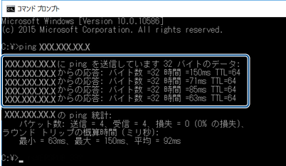 「ping xxx.xxx.xxx.xxx」と入力して、Enterキーを押します。