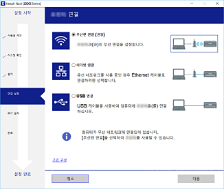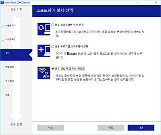 소프트웨어 설치 선택 화면이 표시되면, 연결 방법 변경 또는 재설정을 선택한 후 다음을 클릭합니다.