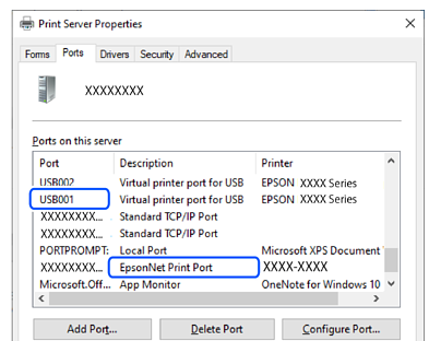 Connexió USB: USBXXX, Connexió de xarxa: EpsonNet Print Port