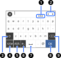 Vaihtaa merkkityyppiä. Voit syöttää aakkos- ja numeromerkkejä sekä erikoismerkkejä, kuten umlaut- ja aksenttimerkkejä. |