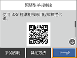 使用 iOS 11 或更新版本上的相機應用。使用 iOS 10 或更新版本上的相機應用無法連接至印表機。此外,使用掃描 QR 碼的應用也無法連接。如果您無法連接,請從印表機控制面板上選取 [其他方法]。詳細的連接說明,請參考「相關資訊」。