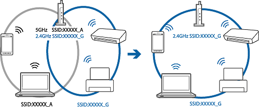 Ένα σημείο πρόσβασης που συμμορφώνεται με τα πρότυπα IEEE802.11a και IEEE802.11g διαθέτει SSID των 2,4 GHz και των 5 GHz.Αν συνδέσετε τον υπολογιστή ή την έξυπνη συσκευή σε SSID των 5 GHz, δεν θα μπορείτε να συνδεθείτε στον εκτυπωτή, επειδή ο εκτυπωτής υποστηρίζει επικοινωνία μόνο μέσω 2,4 GHz.Συνδέστε τον υπολογιστή ή την έξυπνη συσκευή σας στο ίδιο SSID με τον εκτυπωτή.