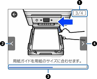 動画を構成する手順の総数と、現在表示している手順が何番目かを示します。 この画面の例では、全3手順中の4番目の手順を表示していることを示します。 |
