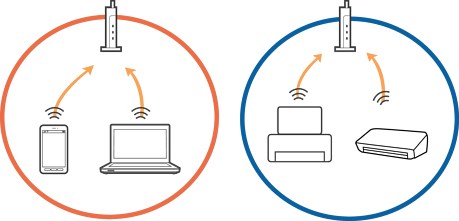 W przypadku korzystania z wielu punktów dostępu równocześnie używanie drukarki z poziomu komputera lub urządzenia inteligentnego może nie być możliwe w zależności od ustawień punktu dostępu.Połącz komputer lub urządzenie inteligentne z siecią o tym samym punktem dostępu, co drukarka.