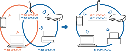 Punkt dostępu zgodny ze standardami IEEE802.11a i IEEE802.11g mają identyfikatory SSID w pasmach 2,4 GHz i 5 GHz.W przypadku połączenia komputera lub urządzenia inteligentnego z identyfikatorem SSID w paśmie 5 GHz nie można połączyć się z drukarką, ponieważ obsługuje ona tylko komunikację w paśmie 2,4 GHz.Połącz komputer lub urządzenie inteligentne z siecią o tym samym identyfikatorze SSID co drukarka.