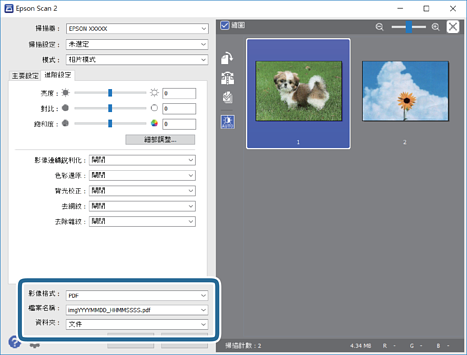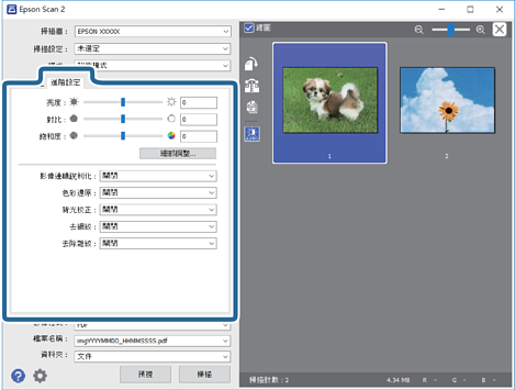 在 Epson Scan 2 中的 [相片模式] 下,您可以用適合於照片或圖片的各種圖形調整功能來掃描原稿。