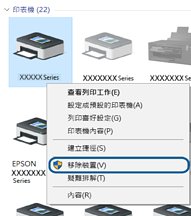 斷開 USB 連接線與電腦的連接。在電腦上顯示的掃描器圖示上按下滑鼠右鍵,然後選取[刪除裝置]。然後將 USB 連接線連接到電腦上,並進行測試列印。