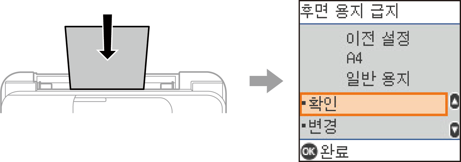 표시된 용지 크기 및 유형이 급지된 용지와 다른 경우 변경을 선택하여 변경합니다. 용지 크기와 용지 종류를 선택하고 설정을 확인한 다음 OK 버튼을 누릅니다. 급지된 용지와 설정이 일치하면 확인을 선택합니다.