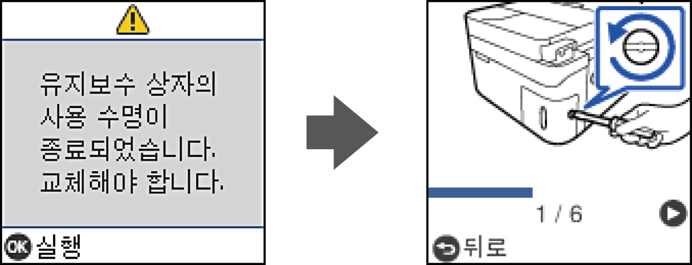 인쇄 주기에 따라 잉크가 다소 과잉 배출되어 유지보수 상자에 수집될 수 있습니다. 유지보수 상자에서 잉크가 누출되는 것을 방지하기 위해 프린터는 유지보수 상자의 용량이 한계에 도달하면 인쇄가 멈추도록 설계되어 있습니다. 교체 여부 및 교체 주기는 인쇄한 페이지 수, 인쇄한 용지 종류 및 프린터가 수행한 청소 횟수에 따라 달라집니다. 교체하라는 지시가 있을 때 유지보수 상자를 교체하십시오. Epson Status Monitor, LCD 또는 제어판의 표시등으로 교체가 필요한 시기를 알 수 있습니다. 유지보수 상자를 교체해야 한다고 해서 프린터가 제품 사양에 따라 작동이 중단된 것은 아닙니다. 교체 비용은 Epson의 무상 보증 서비스가 적용되지 않습니다. 사용자가 직접 교체할 수 있습니다.