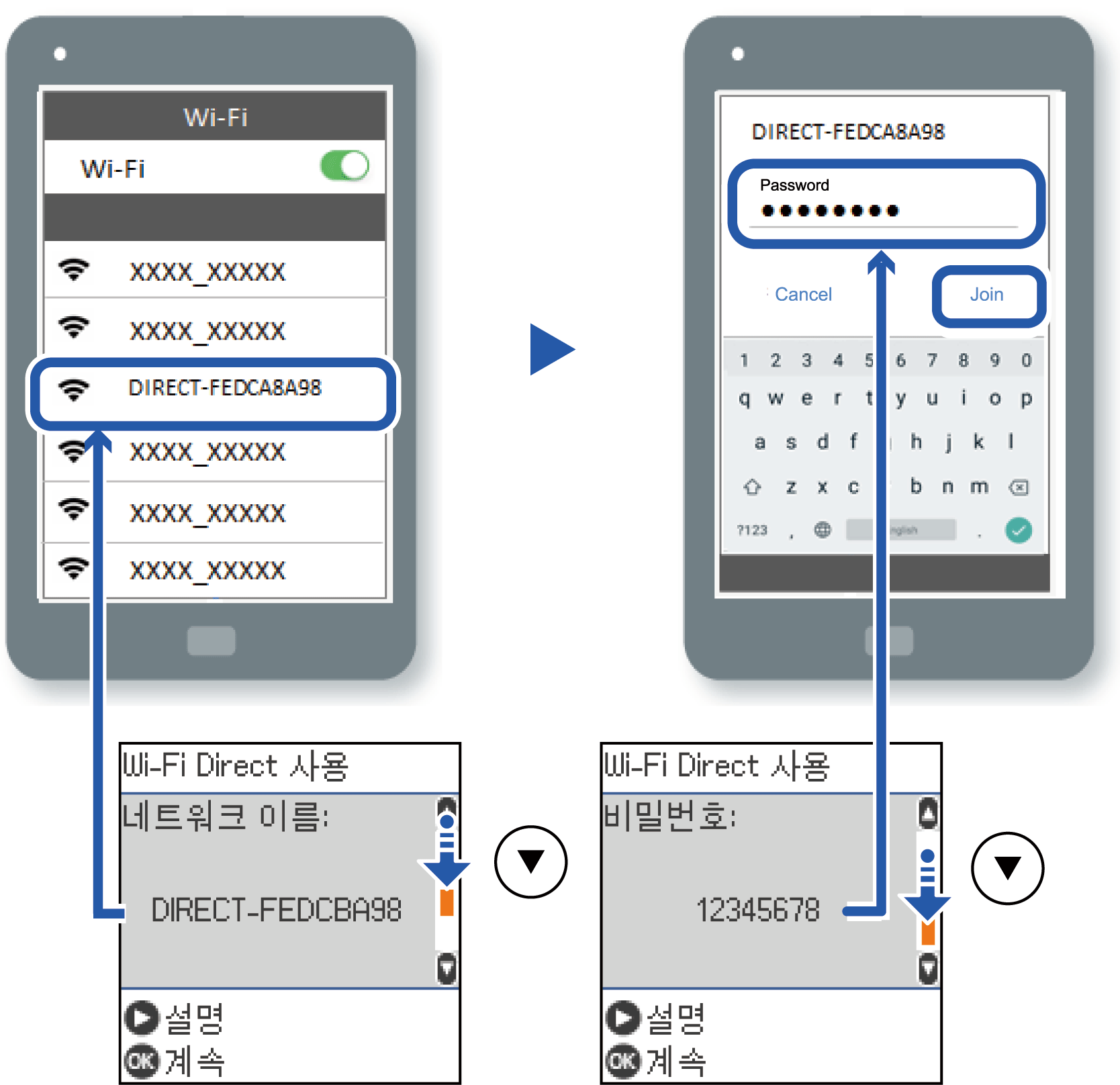 버튼으로 화면을 스크롤하고, Wi-Fi Direct의 연결 정보를 확인합니다.