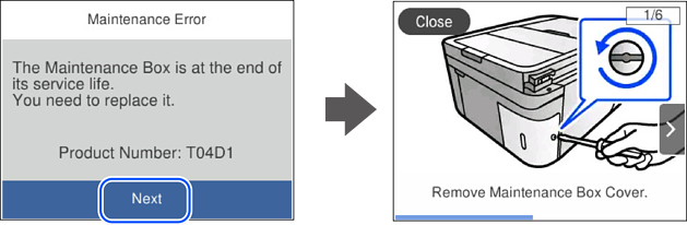 Когато се появи съобщение, което Ви подканя да смените кутията за поддръжка, вижте анимациите, показани в контролния панел. Необходимостта от подмяна на кутията не означава, че принтерът е престанал да работи съгласно неговите спецификации. Гаранцията на Epson не покрива цената на тази подмяна. Това е част, която се обслужва от потребителя.