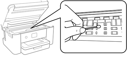 Когато проблемът не може да бъде изчистен след почистване на пътя на хартията, частта вътре в принтера, която е показана на илюстрацията, е зацапана. Изключете принтера и след това почистете мастилото с помощта на памучен тампон.