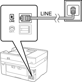 Свържете телефонен кабел от телефонната розетка или порта на телефонната централа към LINE порт на гърба на принтера.