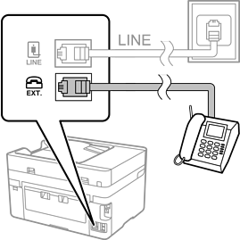 Apabila berkongsi satu talian telefon, pastikan anda menyambungkan peranti telefon ke port EXT. pada pencetak. Sekiranya anda memecahkan talian untuk menyambung peranti telefon dan pencetak secara berasingan, telefon dan pencetak tidak akan berfungsi dengan betul.