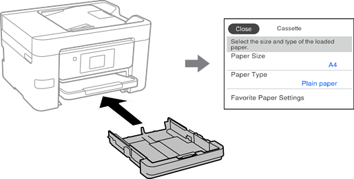 Se o tamanho e tipo de papel exibidos forem diferentes do papel colocado, selecione o item que pretende mudar. Se as definições corresponderem ao papel carregado, feche o ecrã.